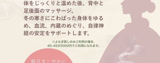 2月、3月のアロマキャンペーン。 今回はご要望が多かったらよもぎ蒸しとアロマトリートメントの組み合わせです。 当院では15年以上前からよもぎ蒸しを取り入れてきましたが、最近では よもぎ蒸し専門サロンも増えて人気の程がうかがえます。 よもぎ蒸しは、よもぎを中心とした薬草を煮出し、 そ…